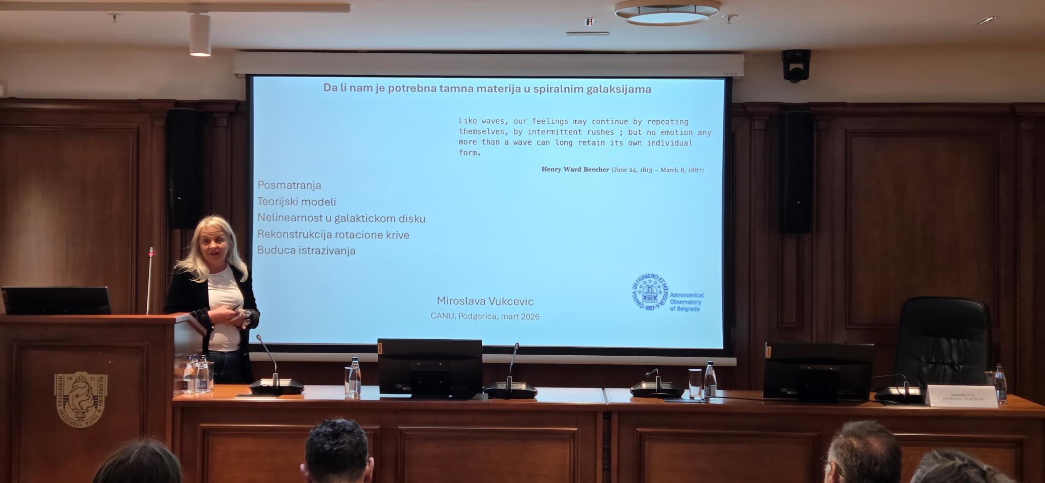 Juče je u Crnogorskoj akademiji nauka i umjetnosti dr Miroslava Savković-Vukčević, viša naučna saradnica u Astronomskoj opservatoriji u Beogradu, održala predavanje na temu „Da li nam je potrebna tamna materija u spiralnim galaksijama“. Predavača je predstavio akademik Predrag Miranović, generalni sekretar CANU.