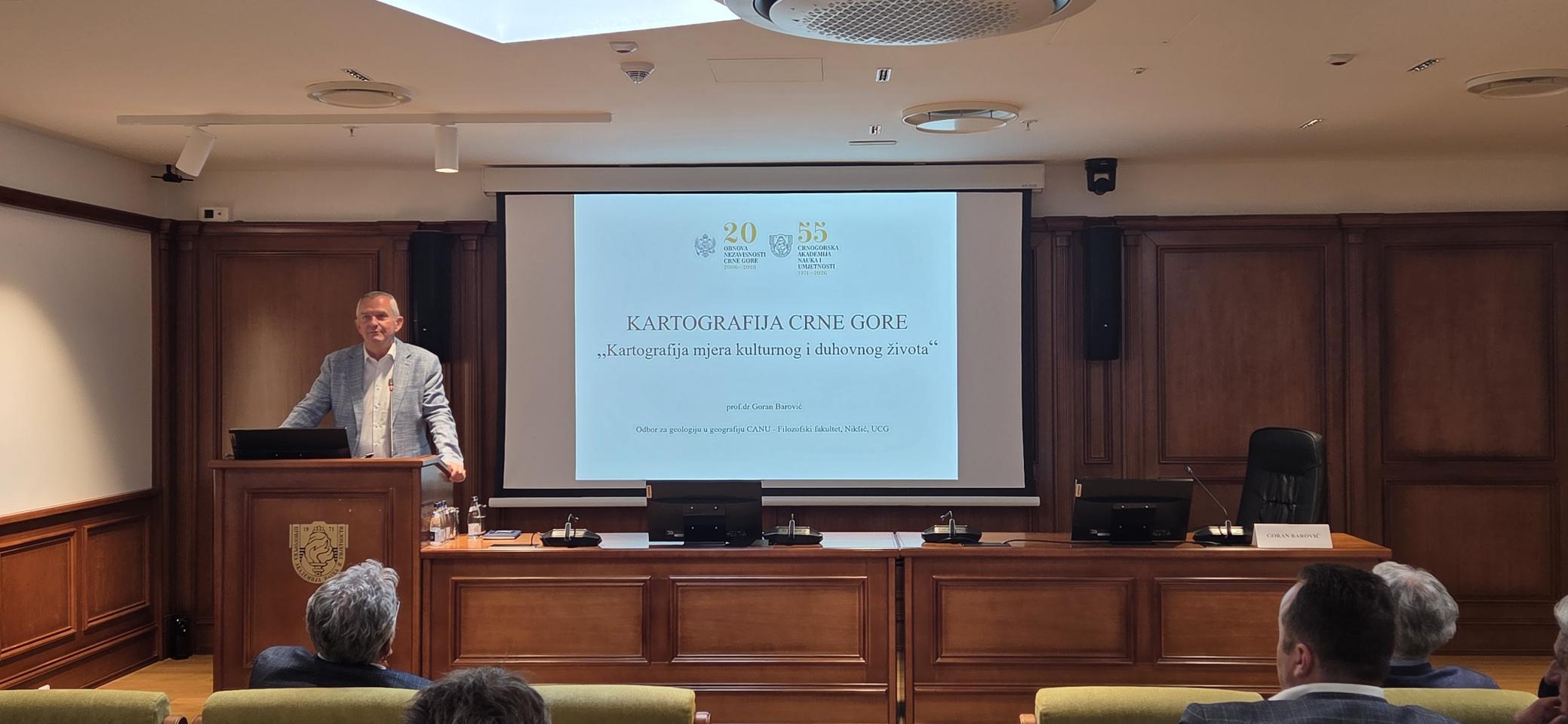 U četvrtak, 9. aprila, u Crnogorskoj akademiji nauka i umjetnosti održano je predavanje prof. dr Gorana Barovića sa Filozofskog fakulteta u Nikšiću (Univerzitet Crne Gore), na temu „Kartografija Crne Gore – kartografija mjera kulturnog i duhovnog života“. Predavanje je organizovalo Odjeljenje prirodnih nauka, u okviru Odbora za geologiju i geografiju, čiji je predsjednik upravo prof. dr Barović. Predavača je predstavio akademik Predrag Miranović, generalni sekretar CANU.