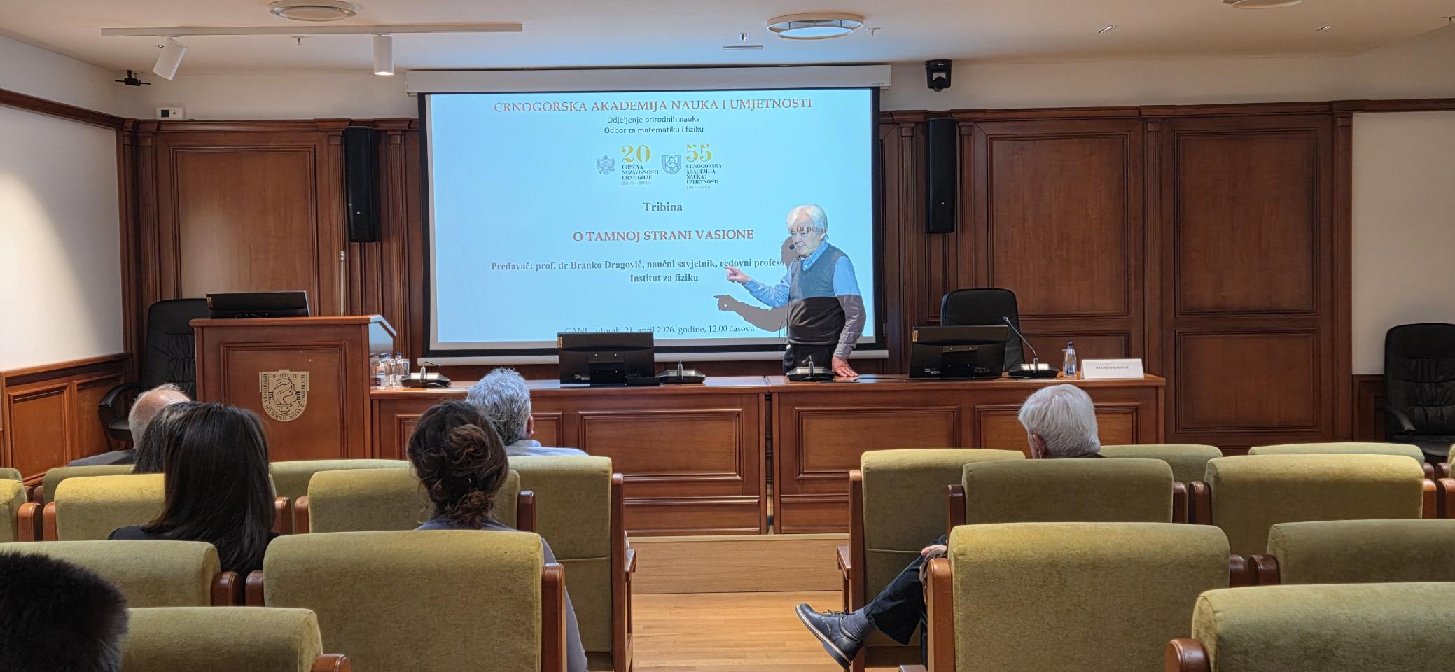 U utorak, 21. aprila, u Crnogorskoj akademiji nauka i umjetnosti održano je predavanje prof. dr Branka Dragovića, naučnog savjetnika i redovnog profesora u penziji sa Instituta za fiziku u Beogradu, na temu „O tamnoj strani vasione“. Predavanje je organizovalo Odjeljenje prirodnih nauka u okviru Odbora za matematiku i fiziku, a predavača je predstavio akademik Predrag Miranović, generalni sekretar CANU.