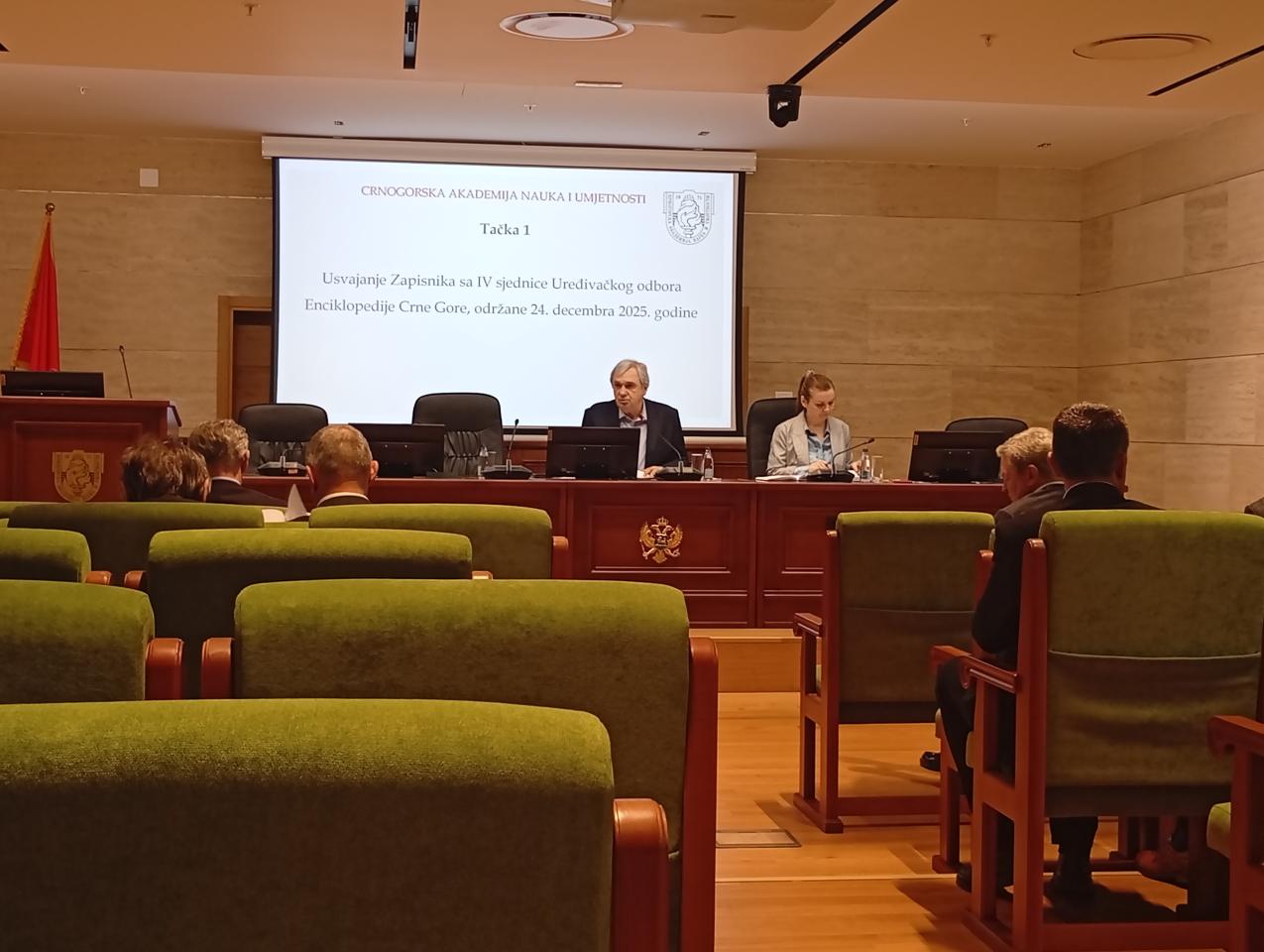 U četvrtak, 12. marta 2026. godine u Crnogorskoj akademiji nauka i umjetnosti održana je V sjednica Uređivačkog odbora Enciklopedije Crne Gore. Sjednici su prisustvovali i glavni i odgovorni urednik Enciklopedije Crne Gore, urednici oblasti, tema i struka, kao i sekretari. Predsjednik Uređivačkog odbora akademik Ljubiša Stanković otvorio je sjednicu. Na sjednici su razmatrane odrednice i kriterijumi, koje je do sada usvojila Redakcija. Glavni i odgovorni urednik Enciklopedije Crne Gore, akademik Dragan K. Vukčević, kao i urednici tri oblasti: Priroda akademik Predraga Miranović, Država i društvo akademik Dragan Radonjić i Kultura akademik Niko Martinović predstavili su dosadašnje aktivnosti na izradi Abecedara. Ukupan broj usvojenih odredica iznosi 3077 (1712 biografskih i 1365 predmetnih), što čini 90% ukupnog Abecedara. Od ukupnog broja usvojenih odrednica, iz leksikona je preuzeto 1434 odrednice (47%). Nakon diskusije, konstatovano je da će Redakcija nastaviti rad na usvajanju novih kriterijuma i odrednica u narednom periodu, kao i da će razmotriti sve sugestije koje su članovi Uređivačkog odbora uputili Redakciji. Uredništava tema i struka nastaviće aktivnosti na ujednačavanju kriterijuma, kategorizaciji, predlozima ilustracija i autora usvojenih članaka.