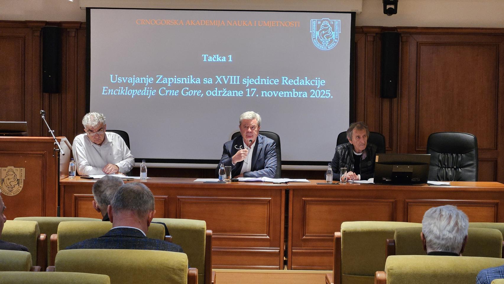 U ponedjeljak, 1. decembra 2025. u Crnogorskoj akademiji nauka i umjetnosti održana je XIX sjednica Redakcije Enciklopedije Crne Gore. Sjednici su prisustvovali i prof. dr Miloš Daković, autor softverskog sistema za rad na leksikonima i Enciklopediji Crne Gore; urednici struka Sport i Mediji i novinarstvo, kao i sekretari oblasti, tema i struka. Trenutni broj odrednica u Abecedaru je 3033 (1603 biografskih i 1430 predmetnih). Redakcija je otpočela usvajanje odrednica, prema prethodno usvojenim kriterijumima. Zaključeno je da urednici tema i struka nastave rad na dopuni kriterijuma i selekciji odrednica, kako bi se na narednoj sjednici nastavilo njihovo usvajanje. Redakcija je zaključila da se nastavi rad i na kategorizaciji odrednica i predlozima autora usvojenih odrednica.